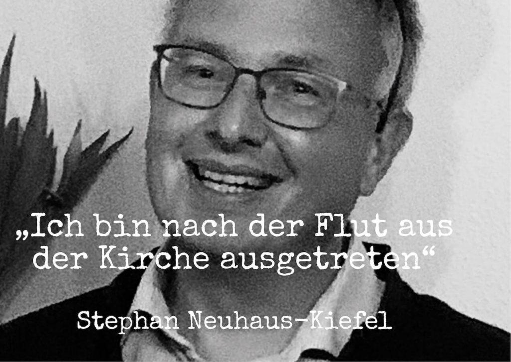 Stephan arbeitet als Trauer- und Hochzeitsredner und ehrenamtlicher Priester für die Alt-Katholische Kirche. In meinem Bekanntenkreis ist er der einzige Trauerredner, den ich kenne. Er spicht darüber, was es bedeutet nach der Flut ganz blockiert zu sein und wie er den Weg aus diesem Zustand findet. Wie wichtig es ist, einige Schritte nicht zu schnell zu gehen – z.B. – das Geschehene zu erklären oder einen Sinn zu finden, wenn es keinen gibt.