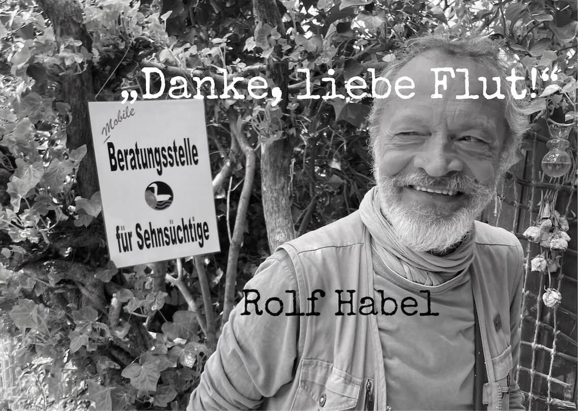 Das sagt der Künstler Rolf Habel, den ich in letzter Zeit im Ahrtal kennenlerne. Er hat die Flut in Bad Neuenahr erlebt und überlebt. Als er vor etwa 20 Jahren ins Ahrtal gekommen ist, war er obdachlos. Die Flut macht ihn obdachlos zum dritten Mal. Aber wenn er „Danke, liebe Flut!“ sagt – meint er das ernst. Und mehr. Jetzt startet er sein neues Projekt „Mobile Beratungsstelle für Sehnsüchtige“. Ein Gespräch in Bonn und Bad Bodendorf.
